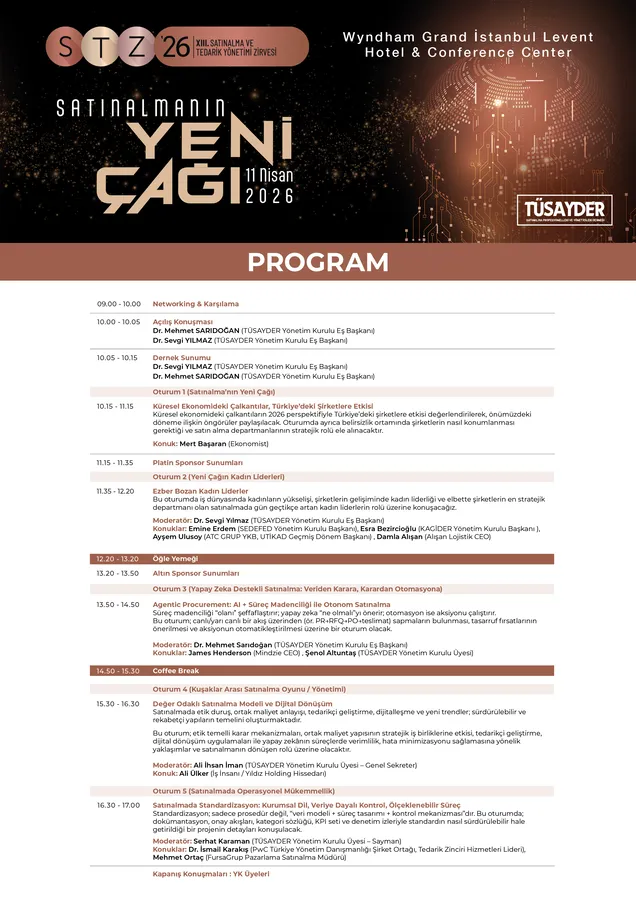 STZ26, 11 Nisan’da Wyndham Grand İstanbul’da Satınalmanın dönüşümü ve kadın liderlerin kriz yönetme formüllerinin konuşulacağı, zirvenin ikinci oturumu olan “Ezber Bozan Yeni Çağın Kadın Liderleri” panelinde; Dr. Sevgi Yılmaz moderatörlüğünde, iş dünyasının önemli isimleri Emine Erdem (SEDEFED YK Başkanı), Esra Bezircioğlu (KAGİDER YK Başkanı), Ayşem Ulusoy (ATC Grup YKB) ve Damla Alişan (Alişan Lojistik CEO) bir araya gelecek. Oturumda, lojistikten üretime, perakendeden teknolojiye kadar geniş bir yelpazede kadın refleksinin tedarik zincirini nasıl daha “dayanıklı” kıldığı somut örneklerle tartışılacak. Tedarik zinciri ve satın alma alanında çalışan profesyoneller için yenilikleri takip etme, sektör liderleriyle ağ kurma ve geleceğin iş modellerini keşfetme fırsatı sunan "Satınalmanın Yeni Çağı" temalı bu zirve, değişime öncülük etmek isteyenler için kaçırılmayacak bir etkinlik olacak. Ücretsiz kayıtlar https://tusayder.org adresinden yapılabilecek.