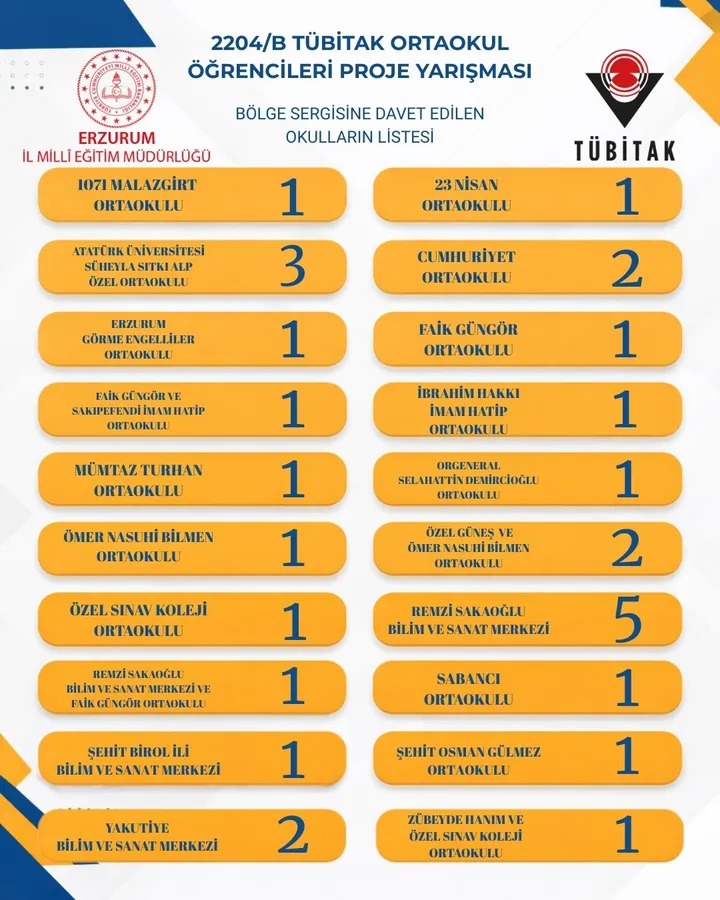 Erzurum, 20. TÜBİTAK Ortaokul Öğrencileri Araştırma Projeleri Yarışmasında 29 projeyle bölge birincisi olarak önemli bir başarıya imza attı. Öğrencilerin bilimsel merakı ve araştırma azmi ile öğretmenlerin rehberliğinde hazırlanan projeler, Erzurum’un eğitimdeki güçlü potansiyelini bir kez daha ortaya koydu.
