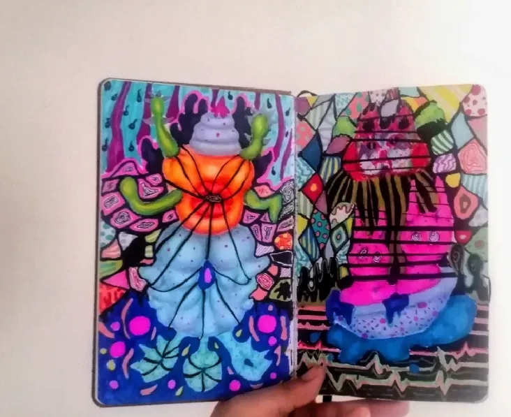 Sanatçı Aydın, zaman içerisinde yeni dokuların, renklerin ve kalemlerin eklendiğini ama çizim yapma şeklinin değişmediğini vurgulayarak, bu ifade biçimine çok alıştığı için doğal bir ifade biçimine, hatta bir alışkanlığa dönüştüğüne dikkat çekti. Aydın’ın çalışmalarında yer alan figürler kimi zaman mitolojik varlıkları, kimi zaman böcekleri ya da maskeleri çağrıştırıyor. Ancak sanatçıya göre bu imgeler üretim sürecinde bilinçli olarak planlanmıyor; çoğu zaman çizim tamamlandıktan sonra anlam kazanan sembollere dönüşüyor. Aydın şöyle devam etti : “Çizim yapma şeklimde nesneler kendiliğinden ortaya çıktığı için çoğu zaman semboller de sonradan bir şey ifade ediyor. Çizim tamamlandıktan sonra dönüp baktığımda bazı imgelerin bir duygunun ya da düşüncenin izini taşıdığını fark edebiliyorum. Yani semboller üretim sırasında planlanmıyor; daha çok sonradan anlam kazanan ifadeler haline geliyor” Sanatçının çizimlerinde hissedilen spontane enerji de bu sezgisel üretim biçiminin bir sonucu. Aydın, üretim sürecinin planlı bir kompozisyon kurmaktan çok sezgisel bir keşif yolculuğu olduğunu vurgularken şu sözleri kullandı : “Kesinlikle sezgisel bir süreç. Çizimler çoğu zaman planlı bir tasarımın sonucu değil; daha çok akış içinde gelişiyor. Çizgi ilerledikçe yeni formlar, dokular ve figürler de o akışın içinde kendiliğinden ortaya çıkıyor. Bu nedenle ortaya çıkan imgeler çoğu zaman kontrol edilen bir kompozisyondan ziyade sezgisel bir dünyanın parçaları gibi görünüyor. Benim için çizim yapmak, belirli bir sonuca ulaşmaktan çok o anın içinde kalmak ve çizginin nereye gideceğini merak ederek ilerlemek anlamına geliyor. Bu süreçte bilinçli olarak yönlendirmekten çok, çizimin kendi ritmini bulmasına izin veriyorum”